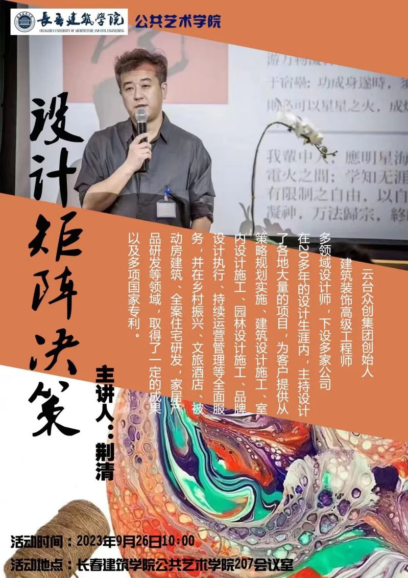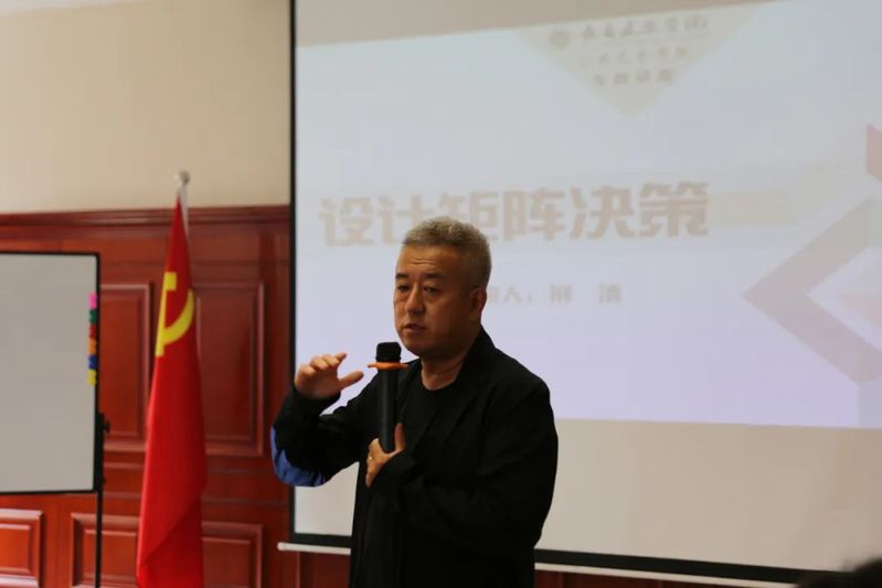 为营造良好的学术氛围,提高专业认知度与参与度,激发师生的学习热情,太阳成集团tyc于2023年9月26日上午10点在207会议室举办了主题为“设计矩阵决策”的学术交流活动,邀请到了云台众创集团创始人荆清先生。参加本次学术交流的有公司环境设计、公共艺术、艺术与科技专业部分师生。