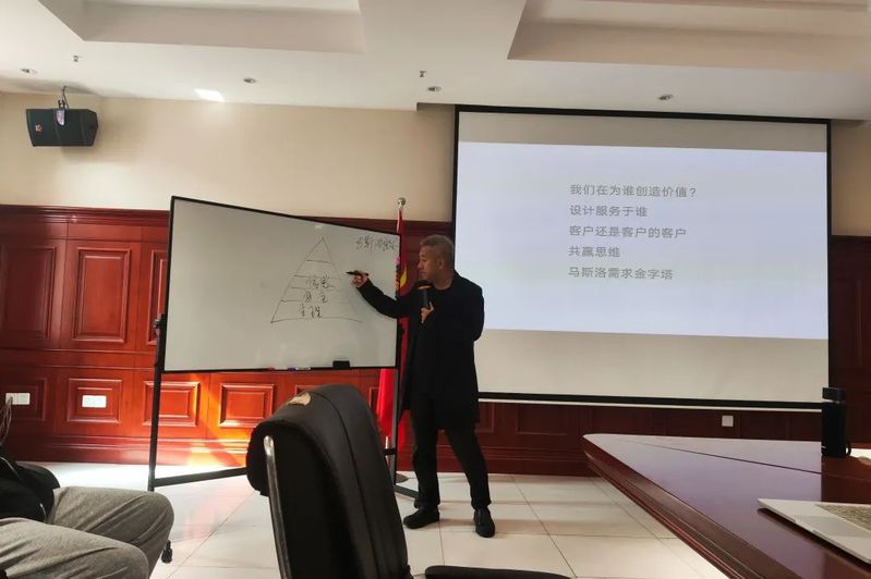 会议中,他提出三个问题:“我们在为谁创造价值”、“谁才是我们最重要的客户”、“我们的价值主张”。用马斯洛需求金字塔举例,强调我们做的每个设计都是做给社会的,要有共赢的思维。分享他设计的幼儿园案例,指出我们在设计中要与客户共情,关注客户的所看、所听、所想,了解客户的痛点和期望。又以”一个空纸杯的联想“举例,明确客户选择你而放弃别人的原因。要求自己做的设计达到101分,多为客户考虑1分。作为环境设计的一名员工,我们必须将设计放置于社会价值,本次讲座不仅使师生身临其境地感受到了设计的魅力,同时拓展了员工的知识面,拓宽了员工的设计思路。最后,荆总引导同学们要正面人工智能,不要规避,更要用属于自己的灵气来与人工智能融合,我们不惧怕未来人工智能的发展,因为我们有的是独一无二的设计想法与创意。